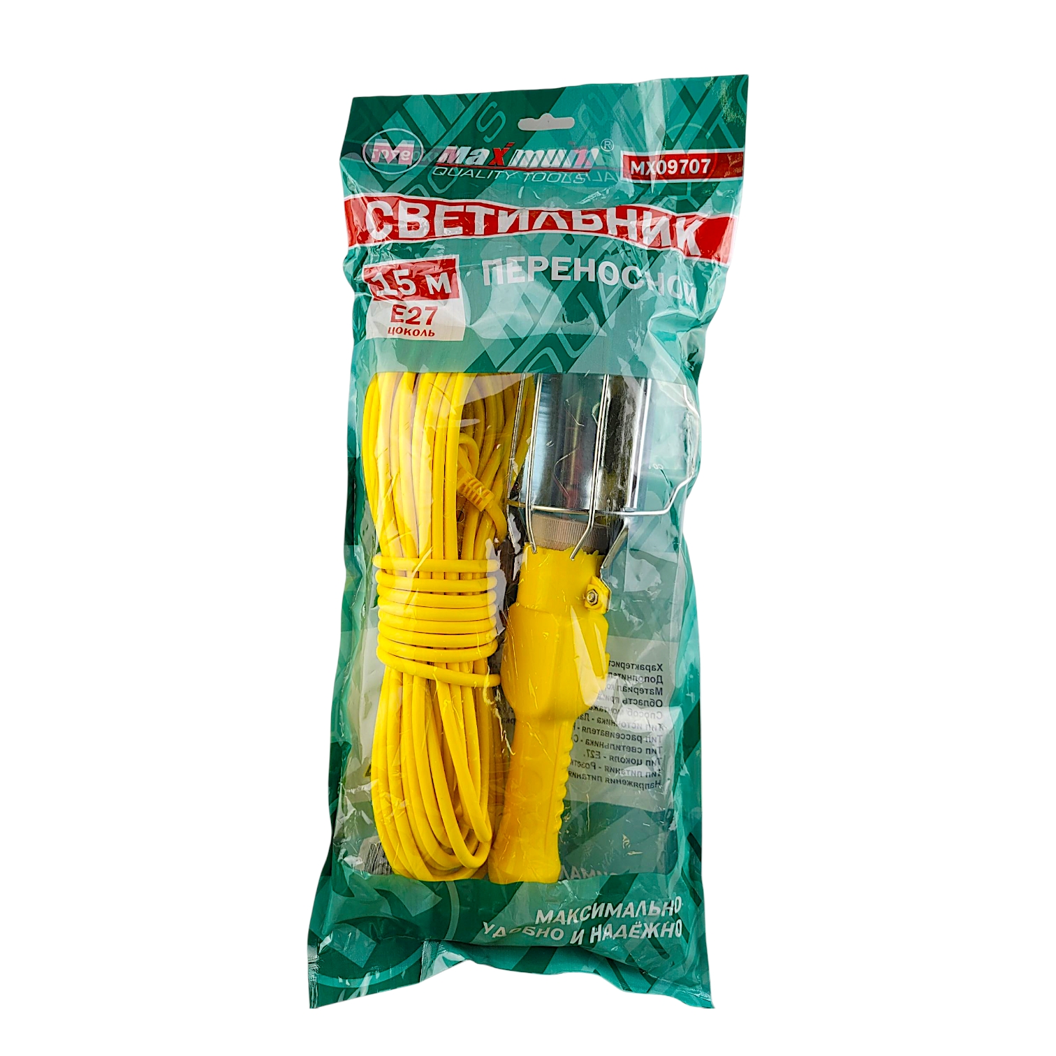 Переносной подвесной светильник 15 м имеет стандартный цоколь Е27 для ламп накаливания. Рассчитан на работу от сети переменного тока с напряжением до 220 В. Переносная лампа для гаража выполнена из жаропрочного и антикоррозийного купола и удобной ручки из ABS-пластика, на которой расположен клавишный выключатель. Для защиты лампа создана защитная стальная решетка.